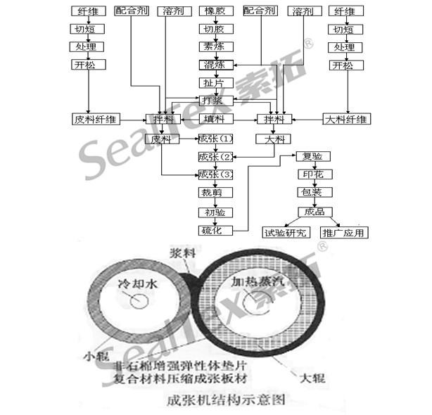 抄取工藝是一種類似造紙工藝的方法,當初是在美國研發(fā)成功,用以生產(chǎn)石棉密封材料。美國的阿姆斯壯 Armstrong World Industry于80 年代研發(fā)成取代石棉的無石棉密封材料后,便一直使用抄取工藝而成為全球軟墊片材料的供應商。用抄取工藝生產(chǎn)無石棉墊片材料在中國還是個新興工藝。在國內(nèi)的墊片材料的供應商中,不到 10 家公司能成功生產(chǎn)真正不含石棉的無石棉墊片材料。下圖顯示的是生產(chǎn)無石棉墊片材料使用的抄取法工藝流程: